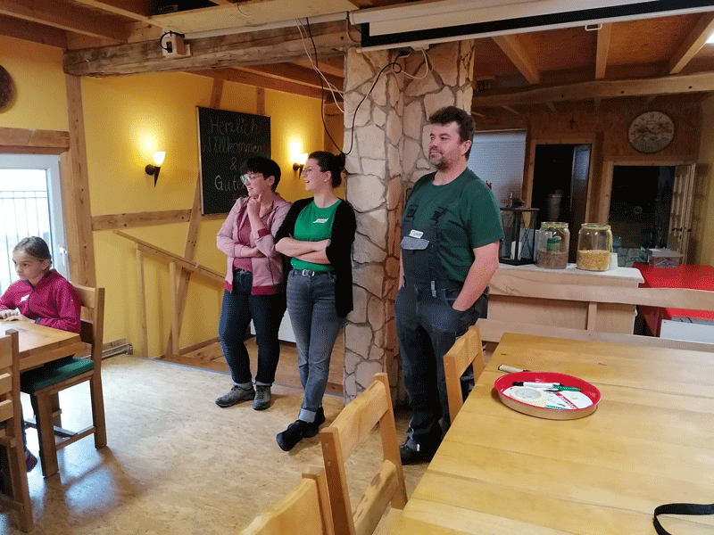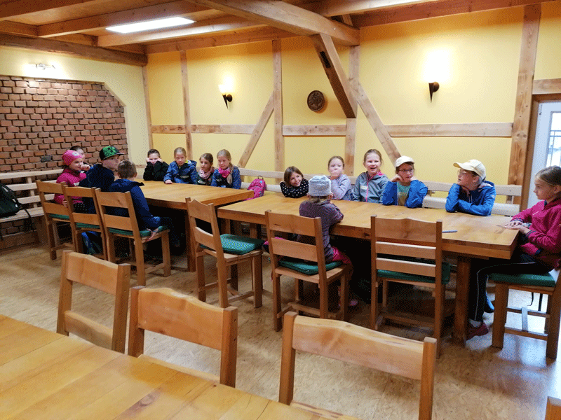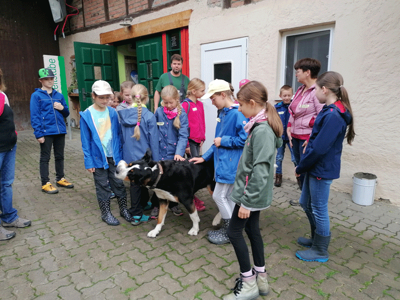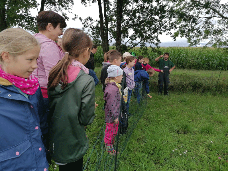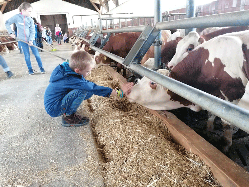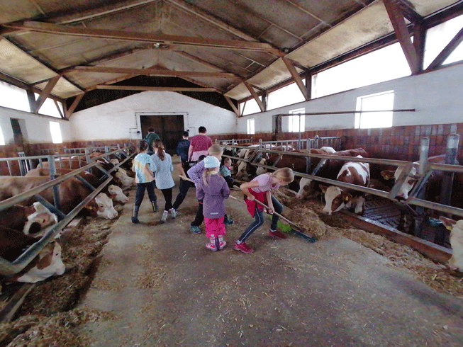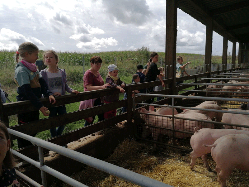 Zunächst stellte die Familie ihren Bauernhof und ihre Tiere vor und hinterfragte das Wissen der Kinder über die Landwirtschaft. Anschließend fuhren die Kinder und das Betreuerteam zum freiliegenden Hühnerstall, wo die Kinder Futter an die Hühner ausgeben konnten.