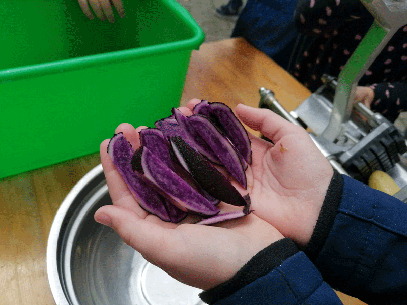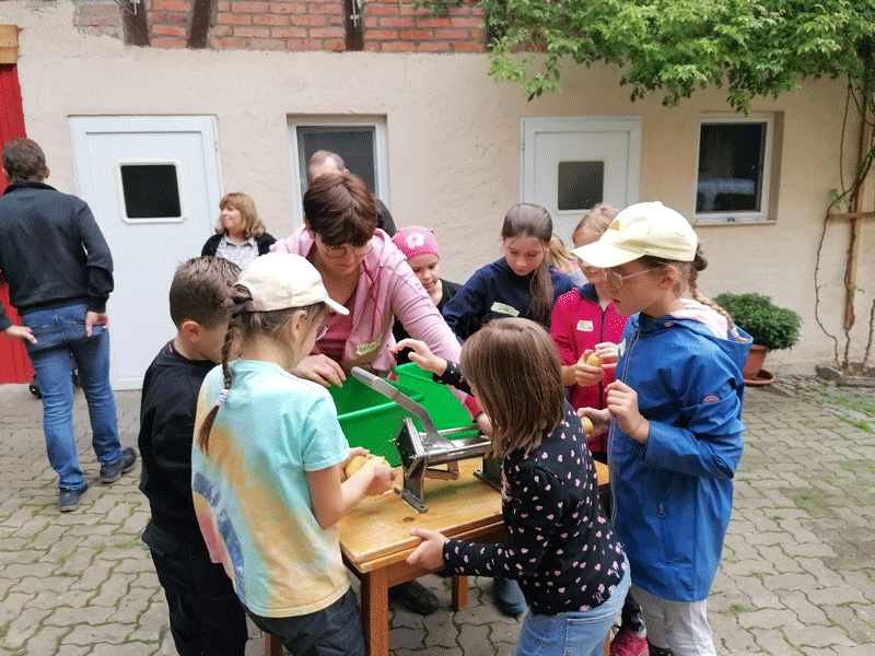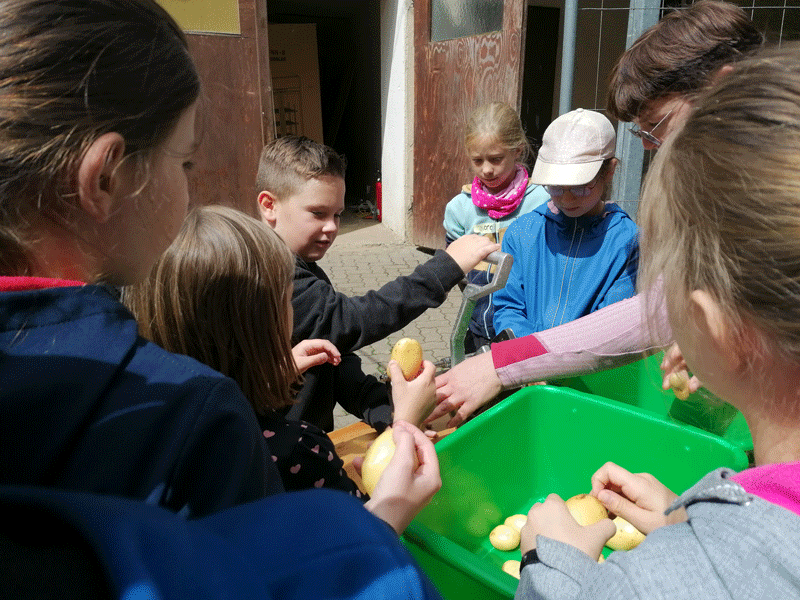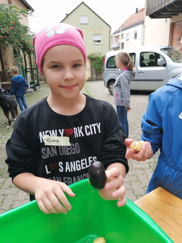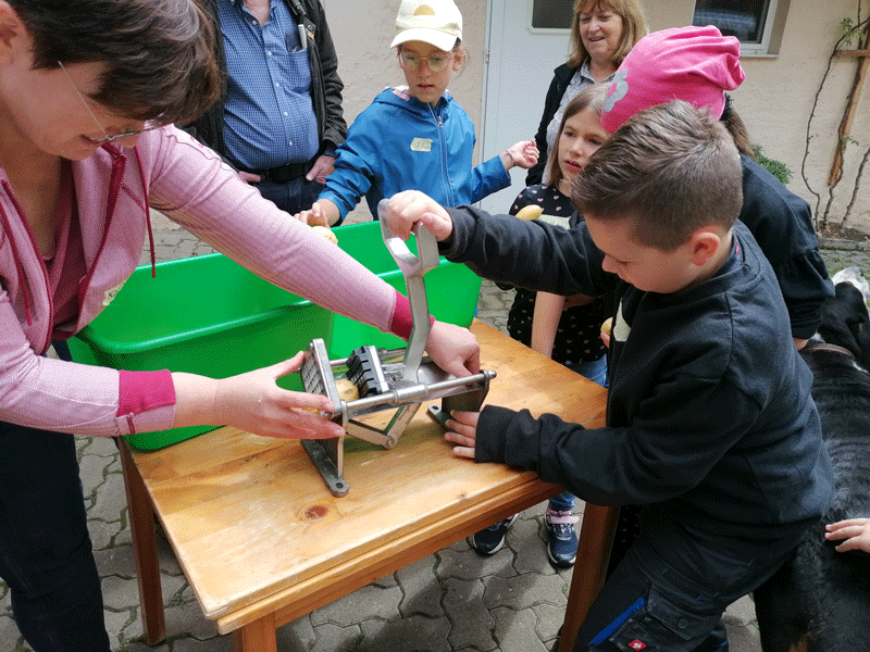 Der nächste Programmpunkt war das gemeinsame Essen: selbst hergestellte Pommes. Familie Schmittfull baut mehrere Sorten Kartoffeln an: helle, vorwiegend festkochende Kartoffeln, lilafarbene und auch Süßkartoffeln. Die Kinder durften die vom Bauern bereitgestellten Kartoffeln waschen und dann alle Sorten durch die Pommes Maschine drücken.