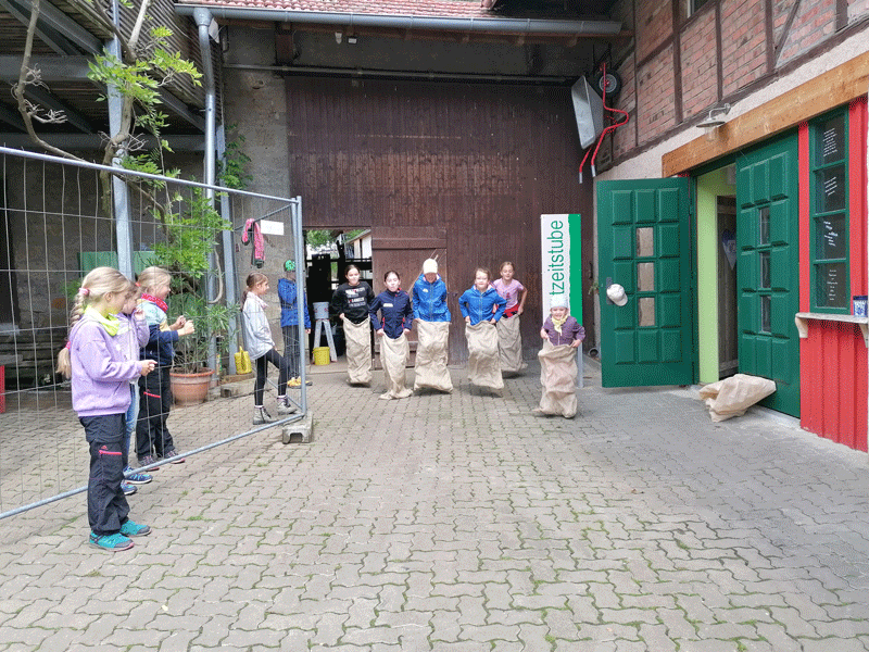 Während Frau Schmittfull die Pommes zubereitete, spielten die Kinder Sackhüpfen und auch mit Hofhund Paula. Mit viel Freude und Genuss wurden die Pommes verspeist. Die weißen waren eindeutig der Sieger in der Bestenliste der Pommes. Gestärkt ging es dann zu den Stallungen. Dort konnten die Kids Schweine, Gänse und Hähnchen besichtigen und im Rinderstall durften sie selbst die Bullen mit Futter versorgen.