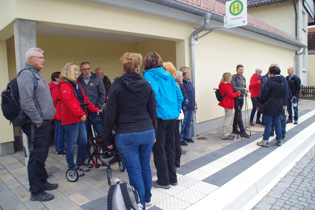 Im Neubaugebiet von Poppenhausen nutzten wir die Zeit, den heutigen Baustil neuer Häuser zu betrachten. Danach ging es abwärts in den Ort und zu unserem Ziel: Gasthof Goldener Stern. Dort genoss die Gruppe gutes Essen, Getränke und nette Unterhaltung.